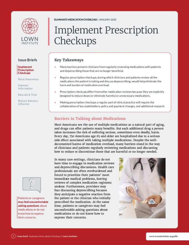 Abstract: To eliminate medication overload, we should implement “prescription checkups,” medication reviews that give patients and clinicians opportunities to deprescribe (discontinue medications or reduce doses) appropriately. This issue brief provides detail on the policy, research, and technological changes needed to successfully implement prescription checkups.