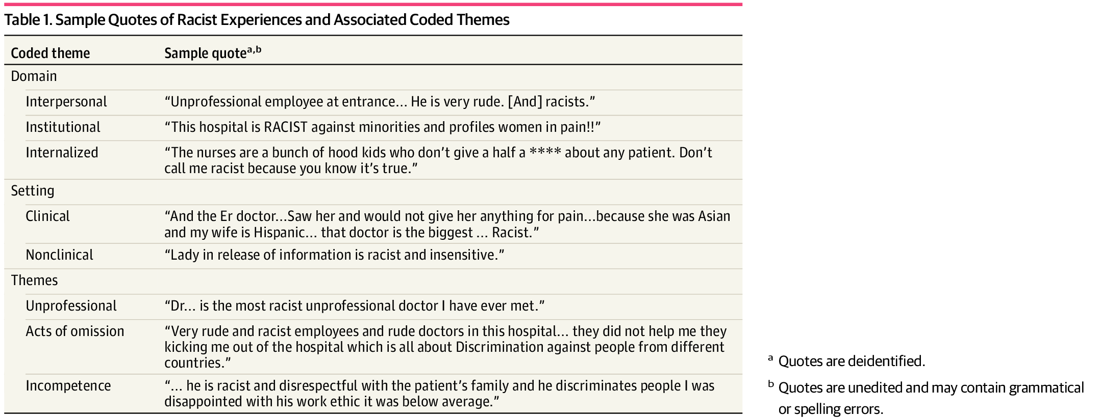 The most common themes within the reviews were patients reporting disrespect or unprofessionalism by hospital staff, and “acts of omission” — not being helped or denied care by the hospital. The data also showed instances of patients using racist language toward hospital staff (usually nurses), demonstrating that the harm from racism comes from all directions.