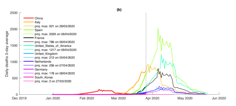 Once countries implemented social distancing measures, their daily growth rate of deaths began to decrease. This suggests that interventions to increase social distancing are effective, even though different countries have implemented measures of different intensities. In addition, predictions of daily and total death rates calculated from the curves confirm that the sooner social distancing measures are put in place, the lower the total death toll.