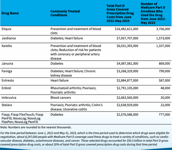 The first ten drugs for potential negotiation were selected last month (see below). In total, these drugs cost Medicare about $50 billion last year, and accounted for $3.4 billion in out of pocket costs for Medicare recipients.
