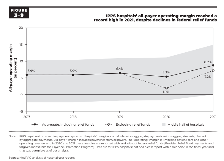 Did the payments work to protect hospitals? In general, yes. According to a recent report from MedPAC, an independent legislative branch agency that analyses Medicare data, average hospital operating margins stayed above 5% in 2020 and 2021, mostly due to the boost from provider relief funds. In fact, hospital operating margins hit a record high in 2021 at 8.7%. This analysis tracks with other studies showing that provider relief funds provided a buffer for hospitals overall.