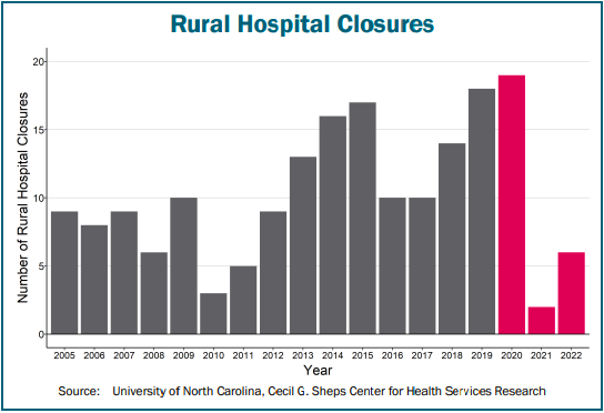 Rural hospitals were especially helped by COVID-19 relief funding; however, for many hospitals, this help came too late. Research on rural hospital closures from the Cecil G. Sheps Center at UNC shows that 19 rural hospitals either closed or converted to urgent care or outpatient only in 2020, an apex in the trend of increasing hospital closures since 2017. However, in 2021 only three rural hospitals converted and none closed outright, which may have been due to the funding boost from the CARES Act.